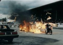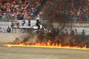 is jumping a cycle over a pit of fire and crashing his steed thru solid